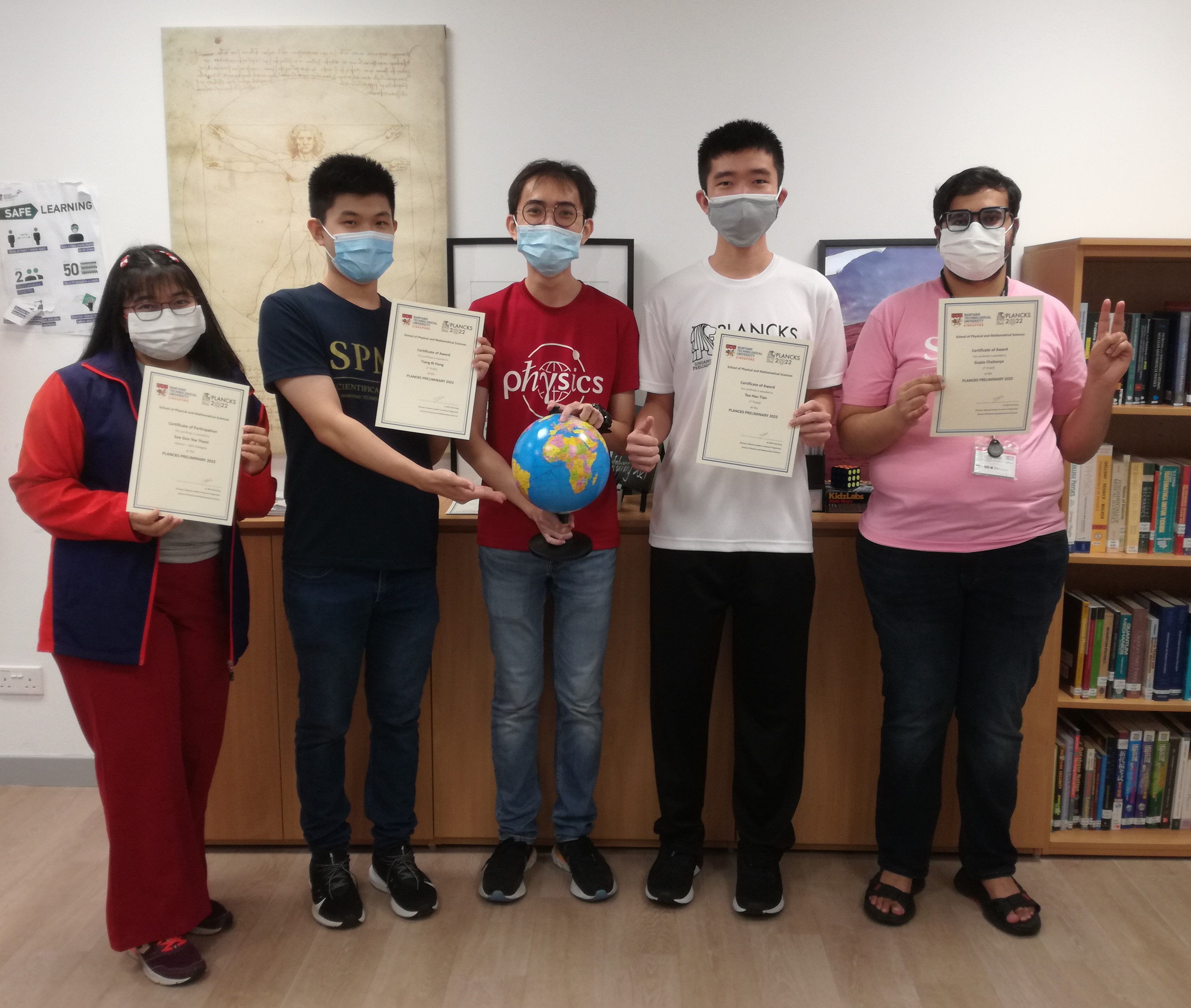 The top prize for the 2022 Singapore Preliminary went to Team V6, comprising of Teo Hau Tian, Chai Siao Yang, Tiang Bi Hong, and Gupta Chaitanya. They will be representing Singapore in the 2022 international PLANCKS competition in Munich later this year.